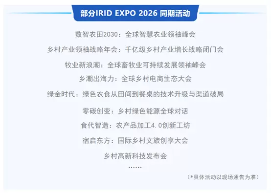 IRID EXPO 2026不仅是一个展示乡村科技发展成果和产品的平台,更是一个推动行业创新升级、促进全球产业交流与合作的重要契机。即刻完成观众预登记,共同见证这场乡村发展领域的国际盛会,携手开创乡村振兴新篇章!