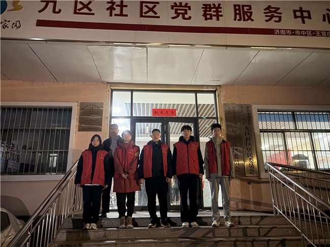 “九区社区党群服务中心”的红色招牌在夜色中格外醒目。实践队员们整齐列队于服务中心门前台阶上,五位身着红色无袖志愿者马甲的队员神情庄重。背景中,“新更万家”的春联寄托着美好愿景,社区居委会的铭牌彰显着基层服务的阵地。一张在服务中心门口的集体合影,记录了他们正式深入社区服务第一线的瞬间,象征着从校园到社会的衔接,从理论到实践的跨越。